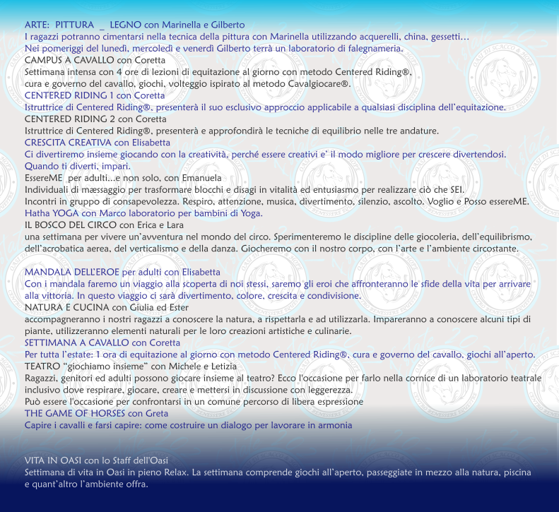 Tutte le attività si svolgeranno all’interno dell’Oasi, immersi nel verde, nella natura e con tutta l’energia dei cavalli che vivono li. La giornata sarà scandita da un momento di accoglienza, dalla pausa a metà mattina, dal pranzo, dalla piscina, dalla merenda per poi terminare con il momento dei saluti.