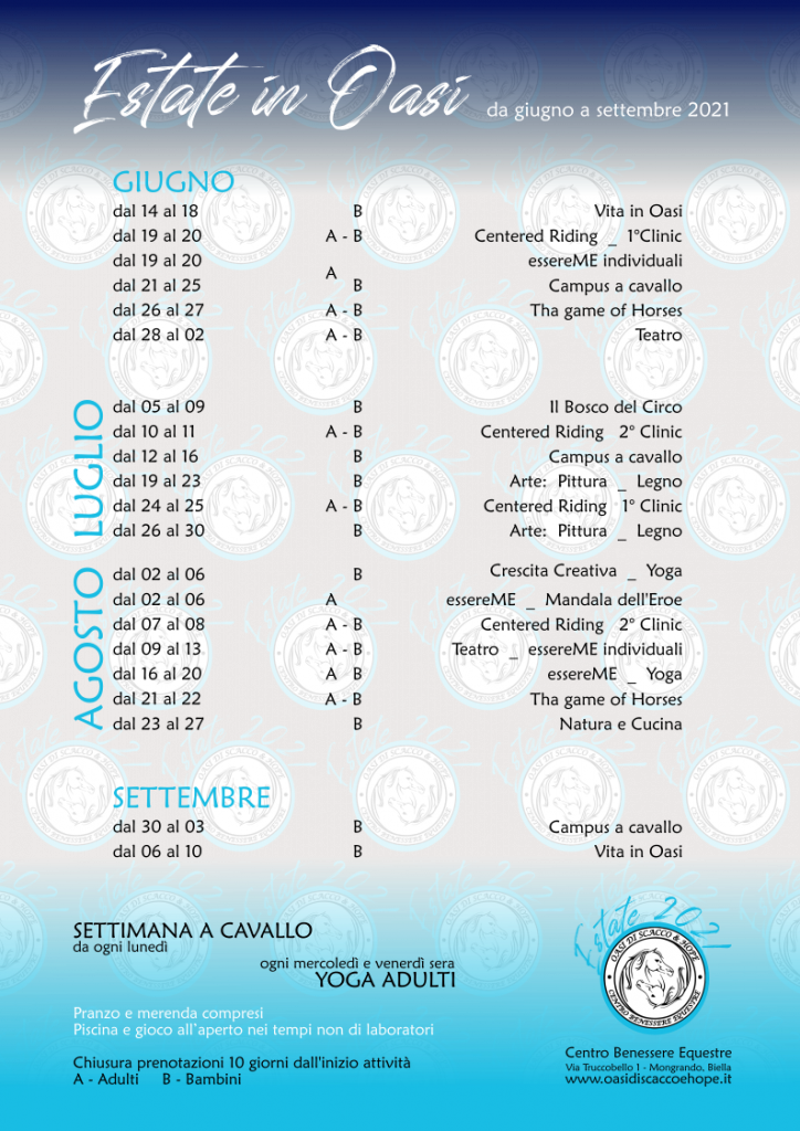 Per maggiori informazioni vi invitiamo a contattarci telefonando ai numeri 3358190395/3343342811 o inviando una mail a info@oasidiscaccoehope.it