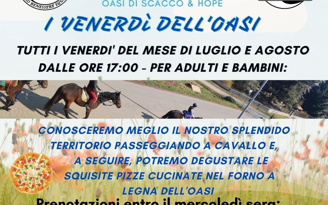Tutti i venerdì dei mesi di luglio e agosto dalle ore 17:00 partiremo con passeggiate a cavallo alla scoperta dei nostri territori e, a seguire, pizza e bevande per tutti ( cavalieri e non )